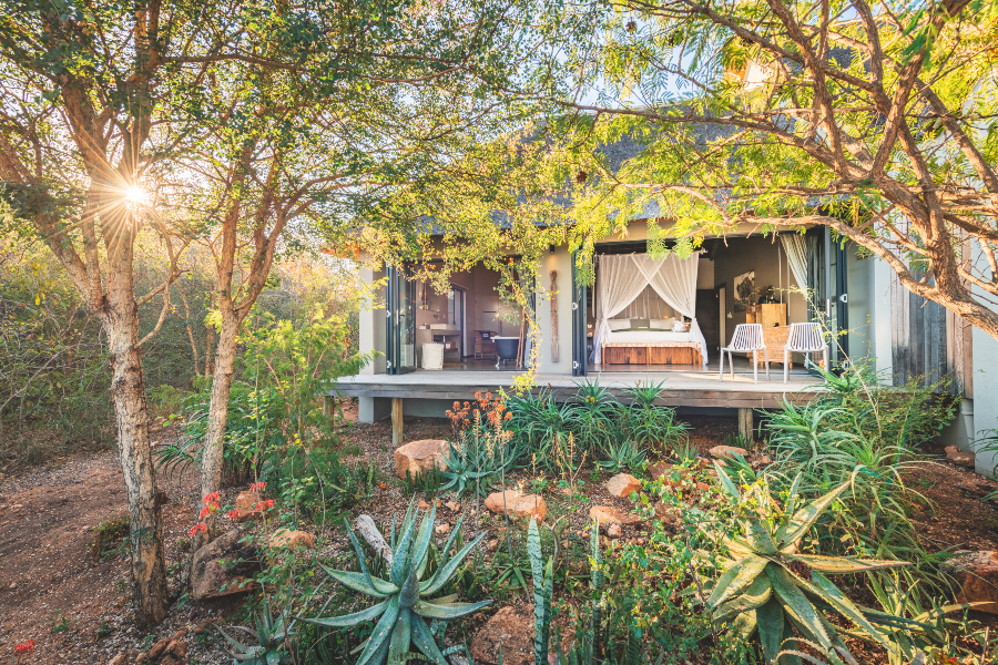 The river suites offer a more traditional lodge experience: beautifully appointed contemporary rooms set parallel to the Sabie, ideal for couples and smaller groups who want the intimacy of a hotel alongside the freedom of the bush.